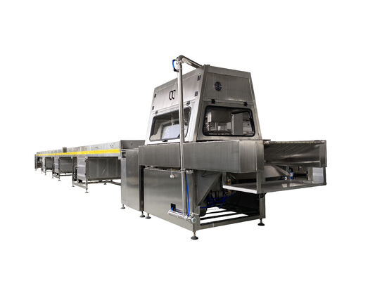 This production line supports dark chocolate, milk chocolate, and compound chocolate, with optional polishing and cooling systems to achieve a glossy, premium finish.